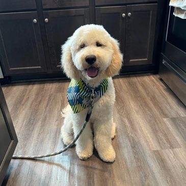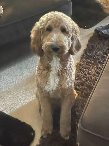 Milo is a one-year-old, 55-lb Apricot multigenerational Goldendoodle.
